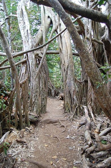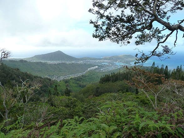 Once I step beyond that resting zone, it’s a steep climb straight to the top. A root-riddled scramble leads to a second bench offering the first panoramic view that stretches over Kuliouou valley out to the sea. Then comes a distinct gnarled archway, woven by banyan branches, that I duck through as I head toward a thin ridge where the views become exponentially more and more beautiful. At this point, a decade or so ago, I once faced a sheer toe and finger scramble up a dirt, or often mud, face until some well-placed ropes aided my way. Now, hikers have the luxury of stairs ? yes, a relative luxury ? and more and more stairs, before finally arriving at a bald plateau. The committed effort makes arrival at the top that much more rewarding.