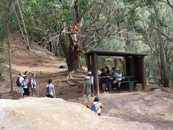 The jaunt follows a series of switchbacks up the side of the mountain before finally approaching a ridge line saddle. The strain of my efforts is instantly washed away by a cooling rush of wind that whispers up through the trees and gushes over me. I follow the main trail as it bends to the left and enters a thick grove of Cook pines before depositing me at the base of a red dirt hill which I climb to arrive at a covered bench. A short breath-catching rest and an energy bar prepare me for the final climb to the peak. When I was younger, I’d sometimes turn back at this point, but the real excitement begins just past the bench.