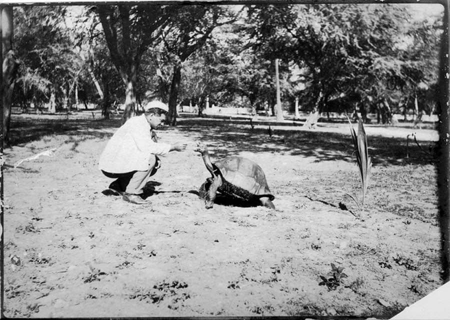 Feeding a tortoise, Waikiki, O‘ahu. Hawaii State Archive photos