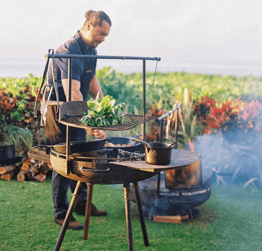 As guests arrive for the weekly Friday, pre-fixe culinary event, they’re welcomed with a champagne sabering and local, farm-to-table fare being cooked the traditional way, over an open fire. Seasonal pupus await, a delightful array of hors d’oeuvres like sourdough bread cooked over the fire and served with gathered Hawaiian salt, and house made mango butter, wild boar smoked over kiawe wood, local taro mochi, and smoked mahi spoons with dashi yogurt.
